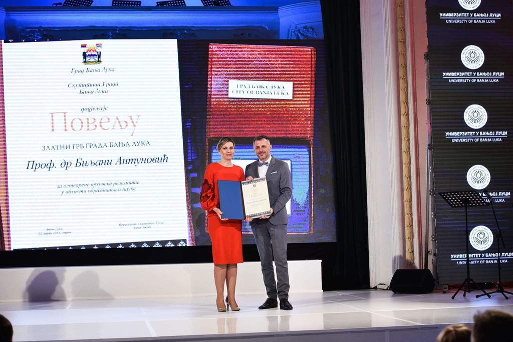 Током свечане академије у Банском двору, златни грб је уручен проф. др Биљани Антуновић, проректору за међународну и међууниверзитетску сарадњу УНИБЛ и професору Архитектонско-грађевинско-геодетског факултета Биљани Антуновић.