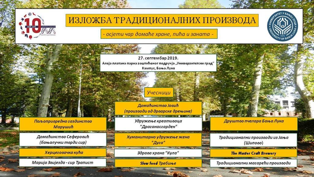 Поред Свечане академије, која је заказана на плаоту испред Института, одржаће се и цјелодневна продајна изложба традиционалних производа под називом ,,Осјети чар домаће хране, пића и заната’’.