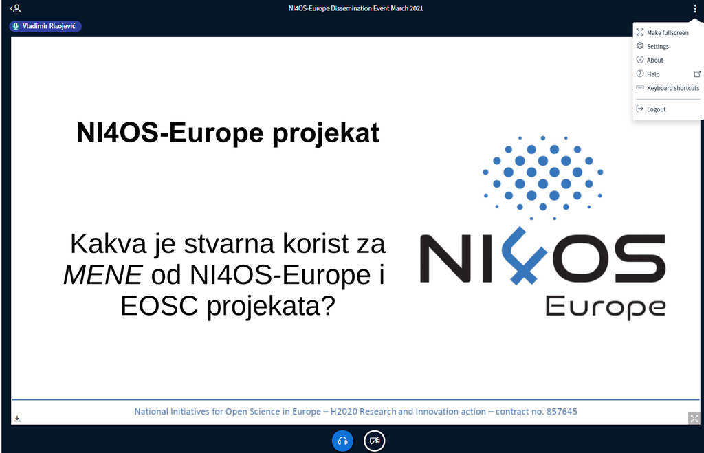 Презентација ,,Која је стварна корист за истраживаче од отворене науке и NI4OS - Европа пројекта“ одржана је 2. марта 2021. године путем видео линка.