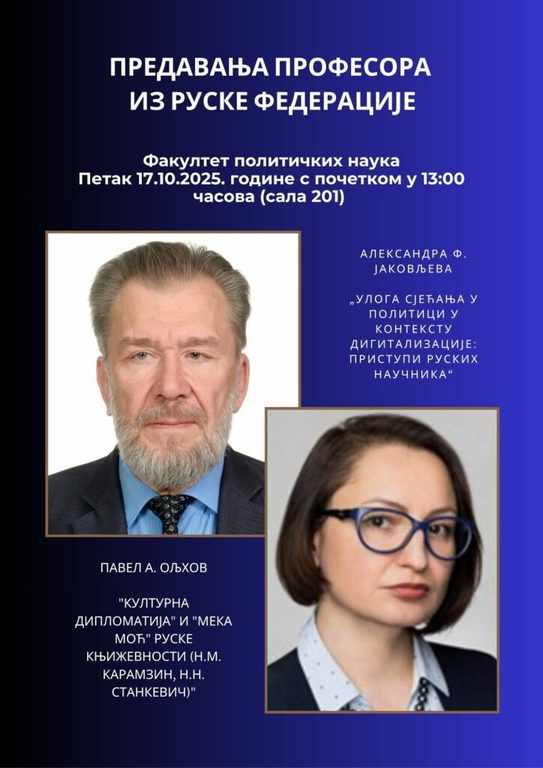 Универзитет у Бањој ЛуциОпштеНа Факултету политичких наука Универзитета у Бањој Луци (ФПН УНИБЛ), 17. октобра 2025. године, у 13.00 часова, биће одржана предавања професора Павела Анатољевича Ољхова и Александре Фјодоровне Јаковљеве, у оквиру међународне сарадње коју овај факултет остварује са еминентним научницима и истраживачима из Руске Федерације.
