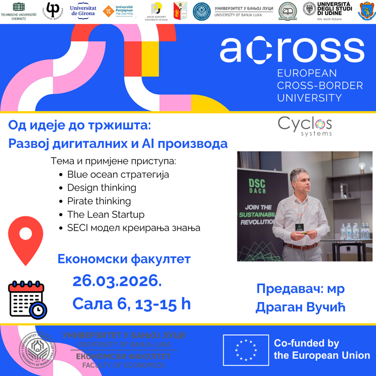 Интерактивна радионица о развоју дигиталних и AI производа, која ће бити одржана 26. марта 2026. године, у 13 часова, у сали 6 на другом спрату, на Економском факултету Универзитета у Бањој Луци.