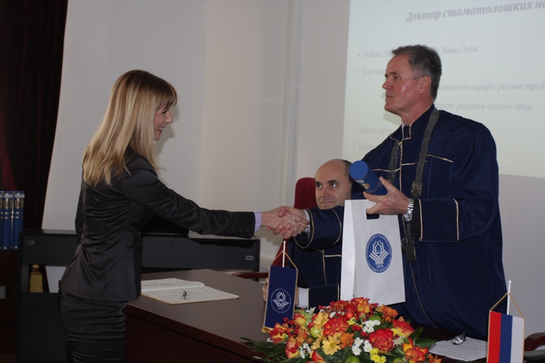 Čestitajući prisutnim doktorima nauka, rektor Stanić je istakao:„Imam dragu obavezu da vam čestitam na uspjehu koji ste postigli, a koji je sadržan u onome što se zove naučno zvanje doktor nauka. Danas kada vam uručujem ovu diplomu doktora nauka u ime Univerzieta u Banjoj Luci potvrđujem da ste ušli u svijet nauke, odnosno u krug naučnih radnika u kome ćete istrajavati i opstajati, gdje ćete prihvatiti postulate koji kažu da je naučnik onaj pojedinac koji je kritička savjest društva“. Rektor je u svom obraćanju naglasio da su bogati oni pojedinci koji su bogati znanjem:„Pođimo od spoznaje da je naučnik onaj koji će za sebe reći 'ako jesam ono što jesam, a ne ono što imam, niko me ne može lišiti osjećaja sigurnosti i identiteta'“. Novopromovisanim doktorima nauka rektor je poželio da u svom naučnom trajanju otkrivaju zrnca naučne spoznaje koja će uticati na stvaranje i širenje novih vrijednosti, naglašavajući da je uvjeren da i oni dijele mišljenje onih koji kažu da nema većeg zadovoljstva od mogućnosti da naučni radnik, odnosno istraživač doprinosi razvitku zajednici kojoj služi.