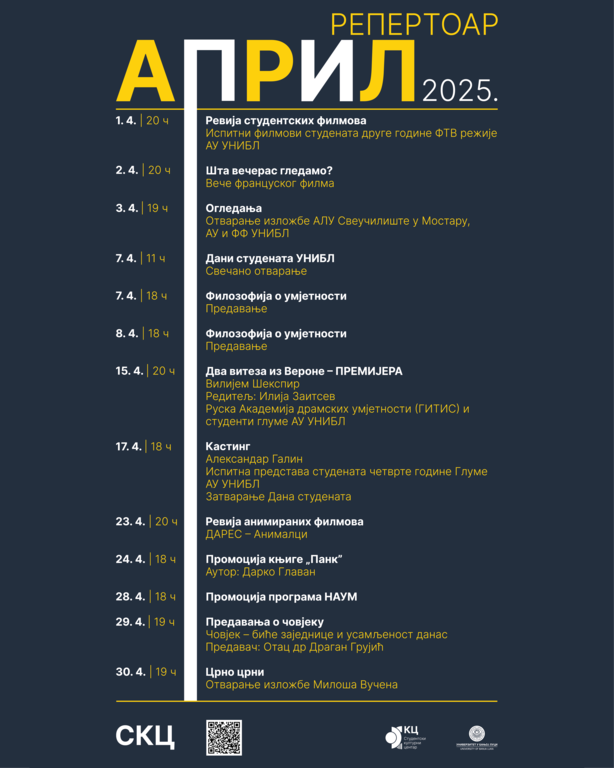 OpšteStudentski kulturni centar Univerziteta u Banjoj Luci (SKC UNIBL) objavio je repertoar programa za april, koji obuhvata pozorišne predstave, filmske revije, izložbe i predavanja.
