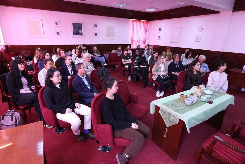 Prof. Čen je publici približila značaj čaja u kineskoj civilizaciji, govoreći o Kini kao domovini čaja, njegovoj istorijskoj i kulturnoj ulozi, simbolici, kao i tradicionalnoj ceremoniji pripremanja i služenja ovog napitka. Ona je naglasila da je čajna ceremonija i danas važan segment kineske kulture, duboko ukorijenjen u svakodnevnim i svečanim životnim trenucima.