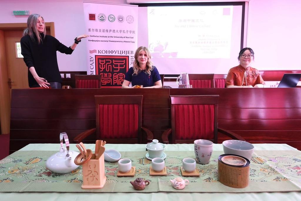 Posjetioci su imali priliku da uživaju u čajnoj ceremoniji koju su izvele predstavnice Konfucijevog instituta iz Novog Sada, uz demonstraciju drevnih rituala pripreme i služenja čaja.