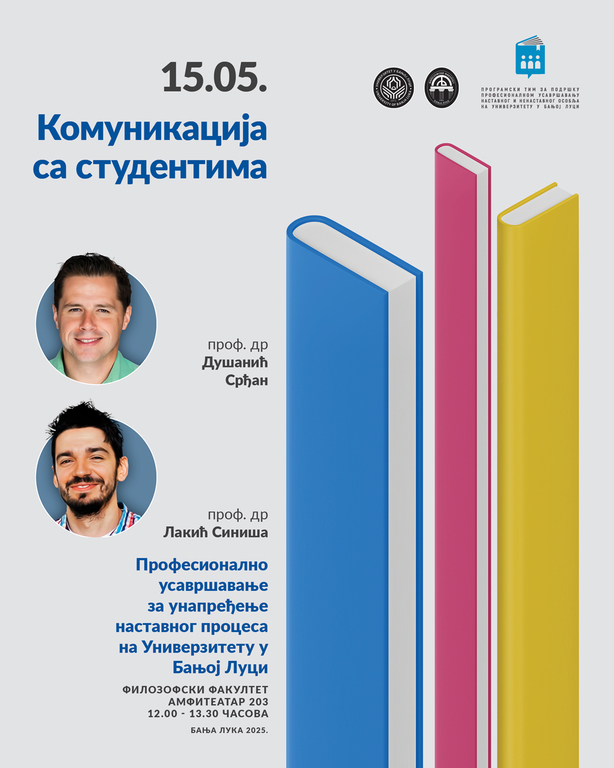 OpšteNa Filozofskom fakultetu Univerziteta u Banjoj Luci (FF/UNIBL), 15. maja 2025. godine, biće održano predavanje pod nazivom „Komunikacija sa studentima – ključ za uspješnu nastavu”.