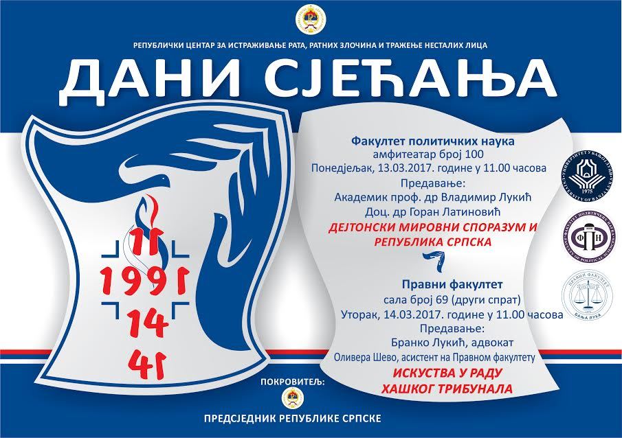Универзитет у Бањој ЛуциОпштеРепублички центар за истраживање рата, ратних злочина и тражење несталих лица под покровитељством предсједника Републике Српске и у сарадњи са Факултетом политичких наука и Правним факултетом Универзитета у Бањој Луци , од 13. до 15. марта организује манифестацију „Дани сјећања“ .