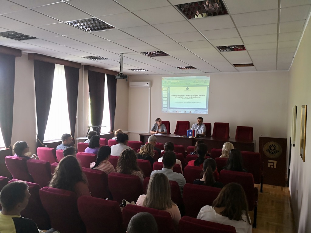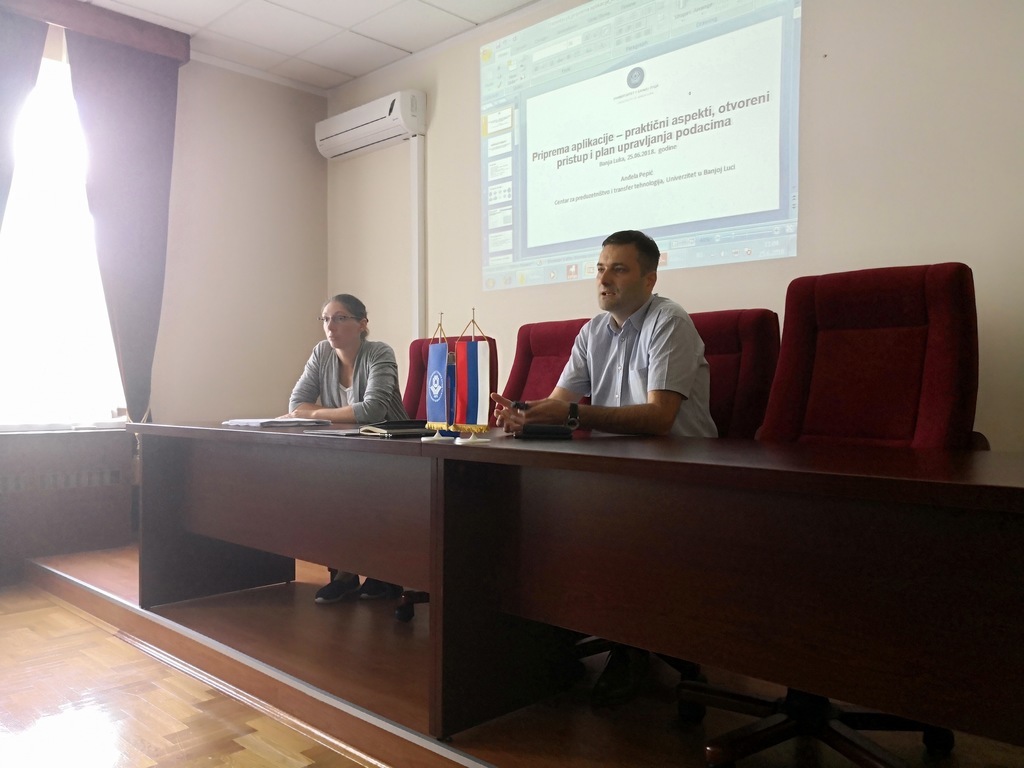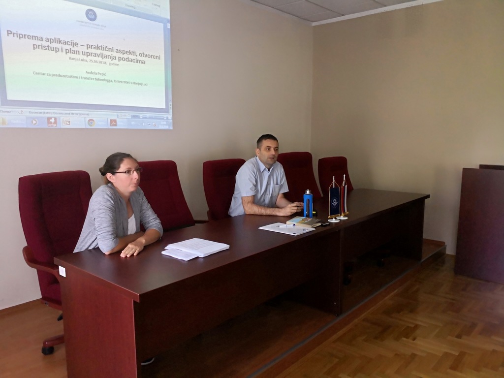 У првом дијелу, мр Анђела Пепић - руководилац Центра за предузетништво и трансфер технологија, присутнима је представила практичне аспекте попуњавања техничког анекса апликација, а посебан фокус је био осигурање отвореног приступа подацима и развоја плана управљања подацима.