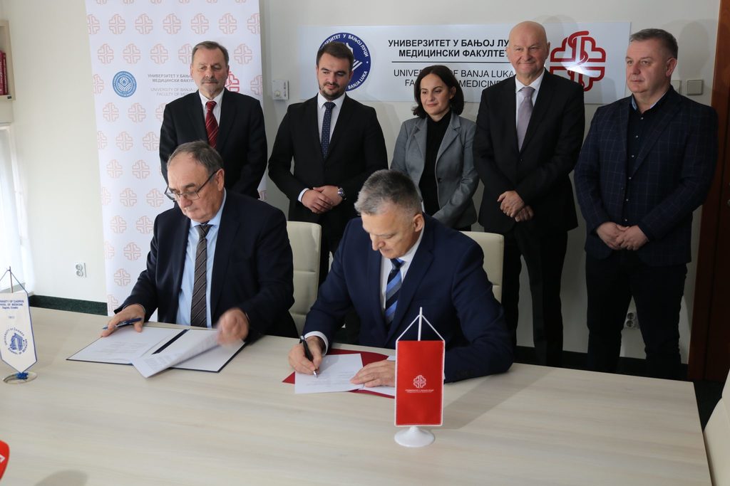 Универзитет у Бањој ЛуциОпштеДекан Медицинског факултета Универзитета у Бањој Луци проф. др Ранко Шкрбић и декан Медицинског факултета Универзитета у Загребу проф. др Славко Орешковић потписали су 25. новембра 2024. године споразум којим је, између осталог, предвиђена сарадња на пољу размјене студената, заједничког научноистраживачког рада и учешћа у пројектима, као и у едукацији.
